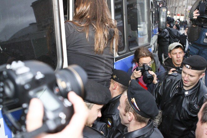 Помимо участников "Другой России", в акции приняли участие активисты "Солидарности", "Обороны", "Левого Фронта" и ОГФ.