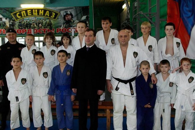 Кроме того, Дмитрий Медведев посетил спортивный зал базы, где проходили занятия по обучению элементам самбо детей подшефной средней школы, а также ознакомился с работой дорожно-патрульной службы полиции.