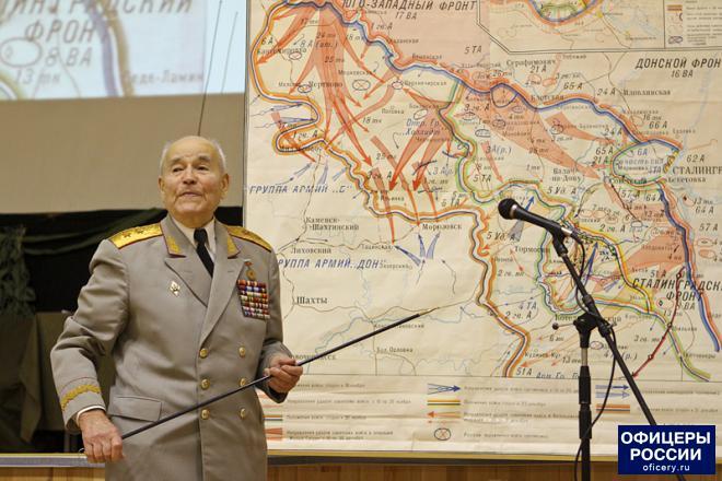 Почетный председатель Совета ветеранов 3-го Гвардейского Сталинградского механизированного корпуса, генерал-лейтенант Николай Орлов рассказал участникам встречи о Сталинградской битве, ее итогах и значении, призвал ребят помнить о героях Великой Отечественной войне и о том, какой ценой была завоевана Победа.