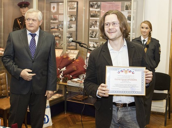 В свою очередь Антон Цветков вручил творческому коллективу телепрограммы «Следствие вели» награду организации «ОФИЦЕРЫ РОССИИ» «Серебрянную сову» за интеллектуальный вклад в развитие правоохранительной системы России.