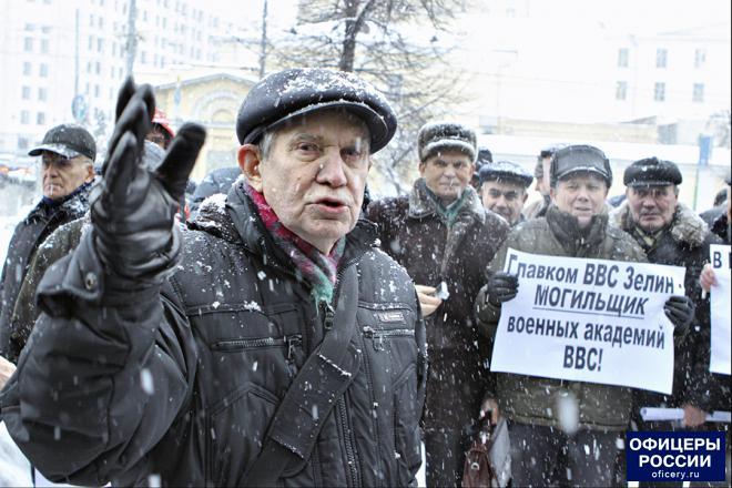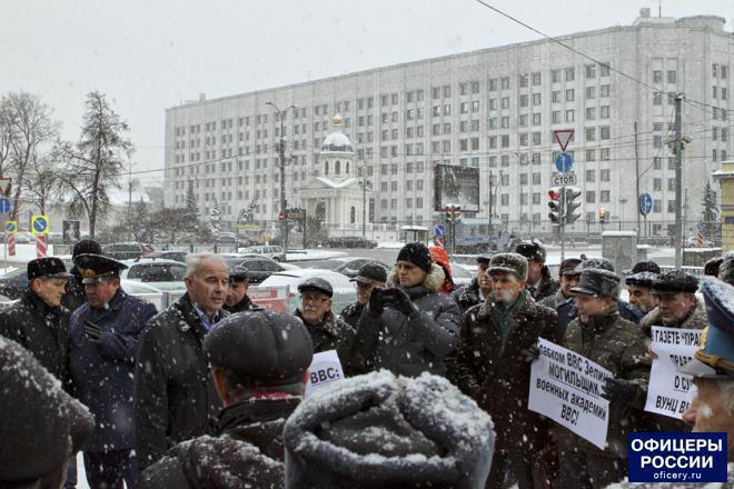 Более 50 человек собрались 12 января на Гоголевском бульваре в Москве, неподалеку от здания Министерства обороны, чтобы выразить свое негативное отношение к планам ведомства закрыть военно-воздушные академии имени Жуковского и Гагарина, и создать на их базе новое учебное заведение, которое будет располагаться в Воронеже.