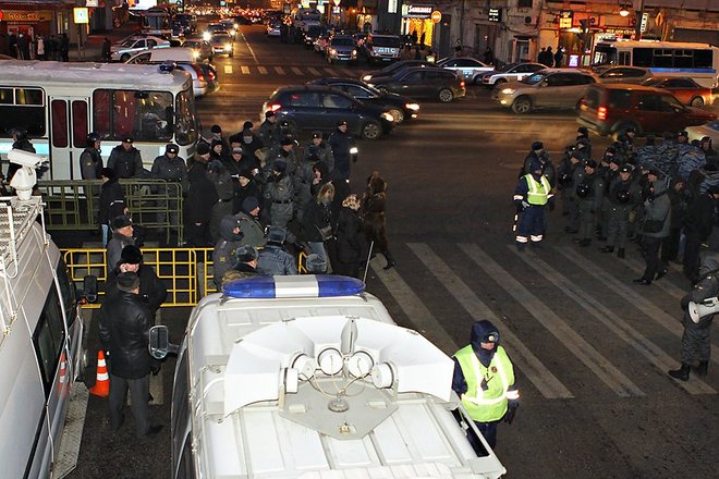 Как передали ИТАР-ТАСС, в целом обстановка на площади 31 января была спокойная, Триумфальная площадь оцеплена, туда были стянуты автобусы с военнослужащими Внутренних войск (ВВ) и сотрудниками ОМОН. Военнослужащие ВВ МВД России были обуты в валенки.
