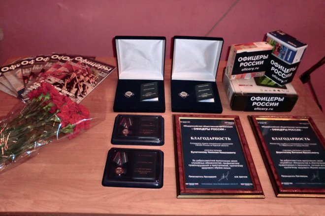Член Президиума Общероссийской общественной организации «ОФИЦЕРЫ РОССИИ», командир отряда специального назначения «Витязь» Николай Соловьев вручил награды организации, благодарности и ценные подарки – два цифровых фотоаппарата и цифровую рамку. Так, орденами «За офицерскую честь» были награждены председатель Курского регионального отделения общероссийской общественной организации ассоциации ветеранов боевых действий, органов внутренних дел и внутренних войск России Владимир Самсонов и председатель совета Курского областного отделения всероссийской общественной организации ветеранов «Боевое братство» Денис Сычов. Медали «За офицерскую честь» получили председатель Курской областной общественной организации общероссийской общественной организации «Российский союз ветеранов», подполковник Вооруженных сил РФ Владимир Евглевский и председатель Курчатовского отделения Российского союза ветеранов войны в Афганистане Иван Ситников.