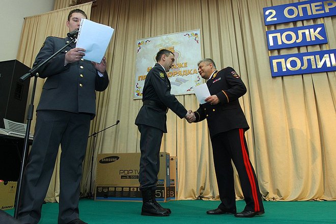 Во второй части торжественного мероприятия Владимир Колокольцев, директор благотворительного фонда «Петровка 38» Александр Обойдихин, а также руководство благотворительного фонда «Мария» вручили награды, почетные грамоты лучшим сотрудникам и ветеранам оперативного полка.