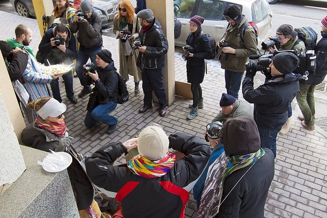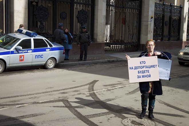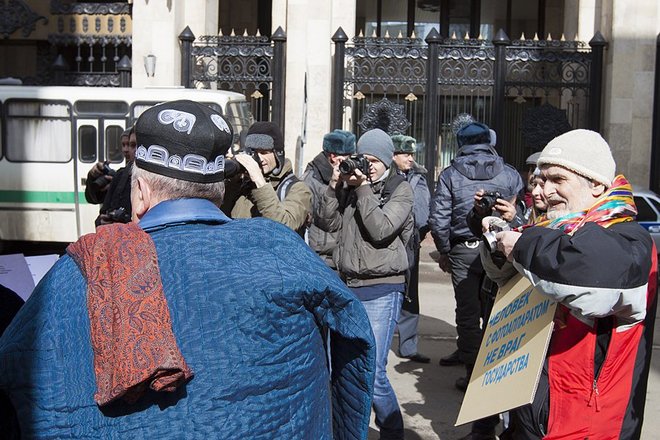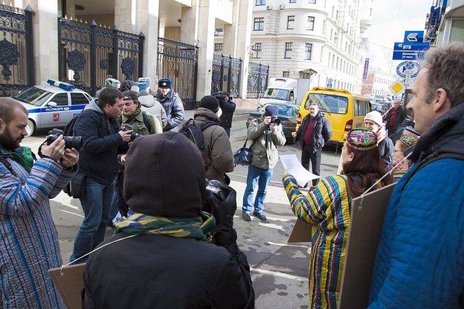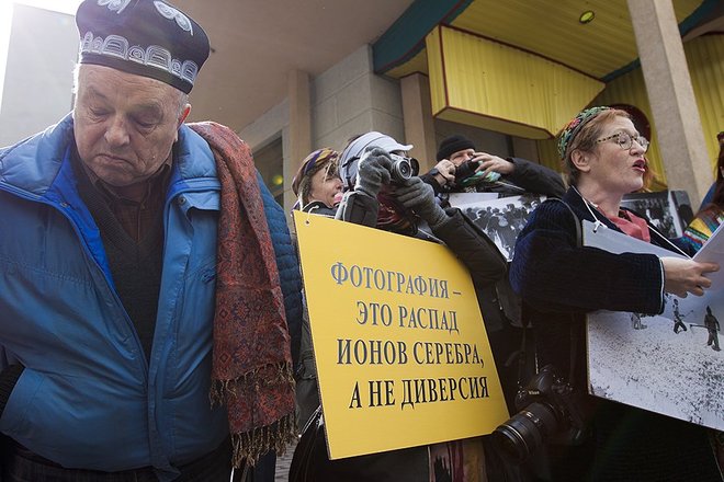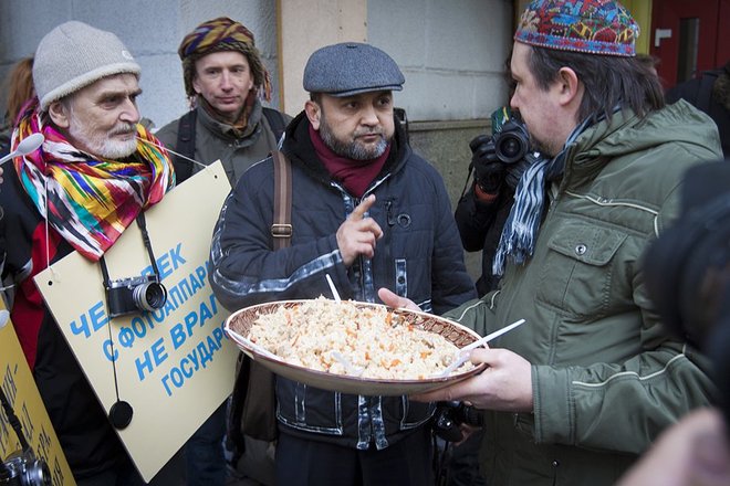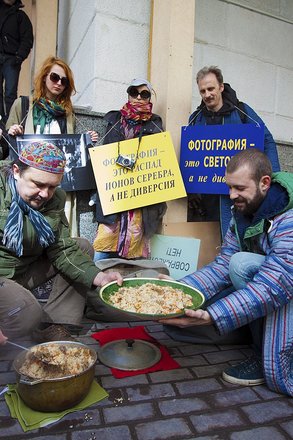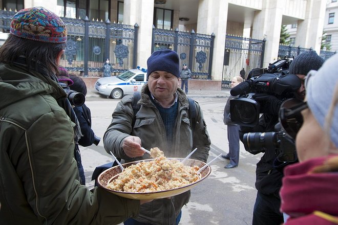 «Свобода слова не хуже плова!» – под таким девизом 2 апреля у здания посольства Узбекистана в Москве прошел санкционированный пикет московских фотографов в защиту прав фотожурналистов. На него собрались около 20 человек, в их числе были известные фотографы и деятели культуры.