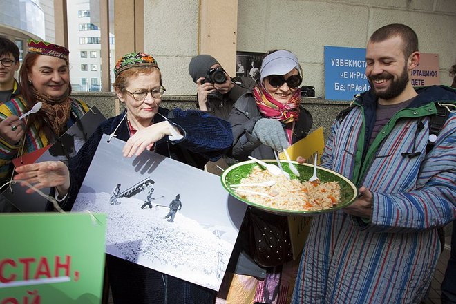 Как пояснили организаторы пикета, акция у посольства не была «акцией протеста». Ее участники, облаченные в национальные узбекские халаты, читали стихи Анны Ахматовой и угощали собравшихся пловом из казана.