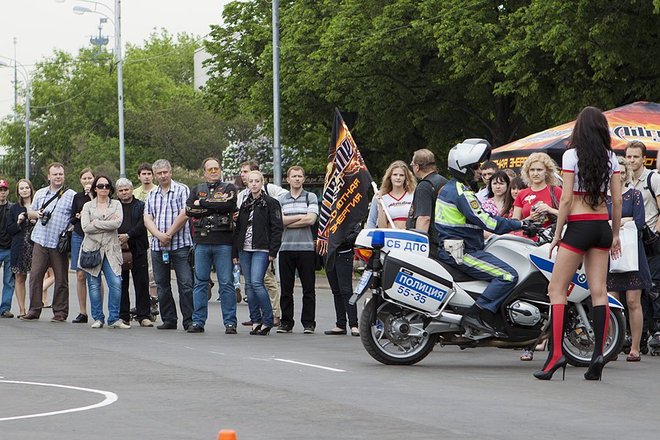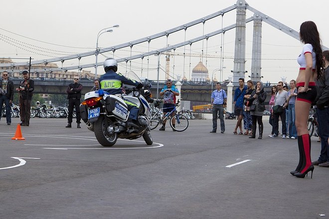 В рамках шоу сотрудники мотобата ГИБДД Москвы провели показательные выступления и устроили для байкеров своеобразный экзамен на знание правил вождения мотоциклом.