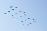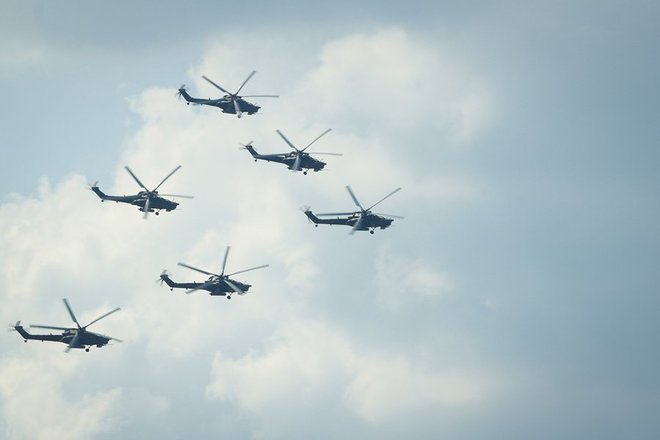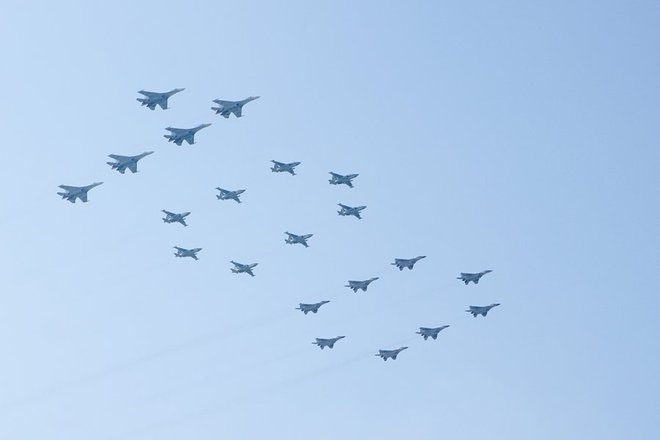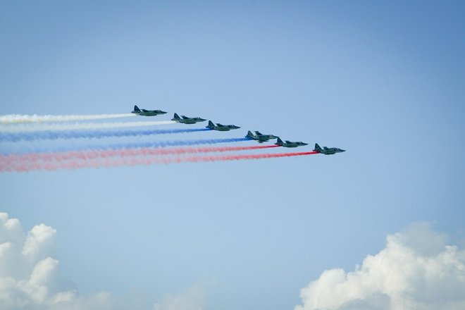 Всего в праздничных мероприятиях участвовали более 110 самолетов и вертолетов, среди которых перспективный авиационный комплекс Т-50, новейшие самолеты оперативно-тактической авиации – Су-34, МиГ-29, Су-27, МиГ-31, Су-25, Як-130 и их модификации, крылатая техника Дальней авиации – Ту-160, Ту-95МС, Ту-22М3, Военно-транспортной авиации – Ан-124, Ан-22, Ил-76, Ан-140, Л-410, Ту-134, специальной авиации – А-50, Ил-80, вертолеты армейской авиации – от новейших Ми-28Н, Ка-50 и Ка-52, Ми-35 – до самых массовых Ми-24 и Ми-2.