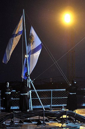 Торжественная церемония вручения ордена Нахимова тяжелому атомному ракетному крейсеру "Петр Великий" прошла 10 января в Североморске. Президент РФ Владимир Путин прикрепил орден и ленту ордена к военно-морскому флагу и вручил стяг командиру корабля Владиславу Малаховскому. Орденский военно-морской флаг был поднят под звуки гимна России, после чего Путин поздравил экипаж крейсера с наградой, передает РИА Новости.