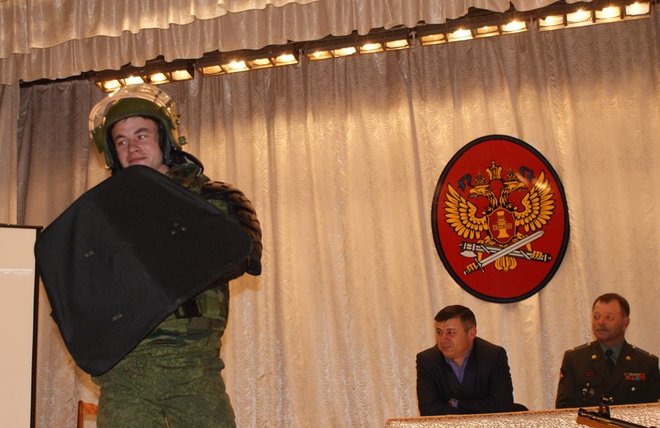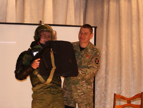 Впервые в жизни участники акции имели возможность примерить все обмундирование сотрудника отдела специального назначения – защитный щитки, бронежилет, шлем, щит, специальный автомат.