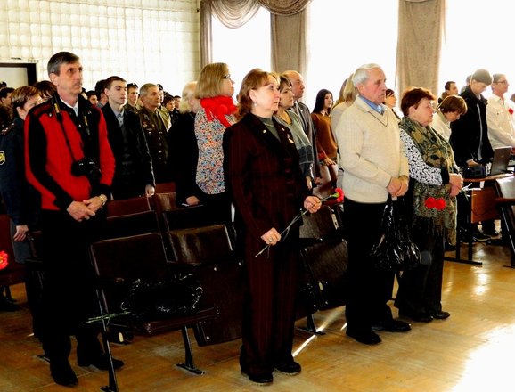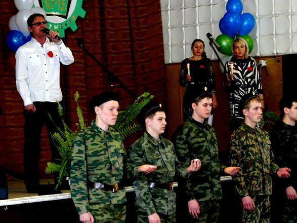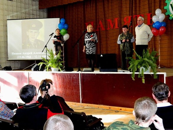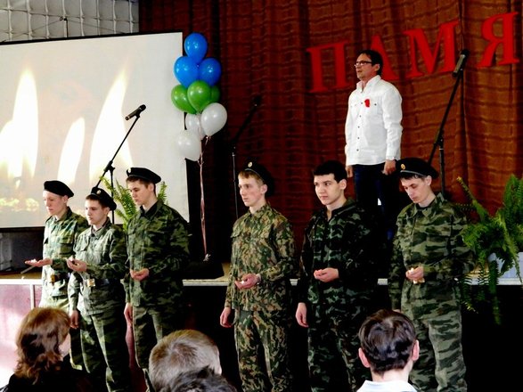 Митинг сменился тематической программой, посвященной Великой Отечественной войне, войне в Афганистане, боевым действиям на Северном Кавказе. Перед собравшимися выступили родные и близкие погибших, ветераны войны в Афганистане, а также региональный представитель «ОФИЦЕРОВ РОССИИ» В. Туров. Бывший летчик, командир звена вертолетов МИ-8 рассказал о войне в Афганистане, боевых потерях, дружбе и взаимопомощи. Кроме того, Туров передал коллективу училища благодарность от Союза ветеранов Афганистана РК, а директору училища И.Н. Герко и заместителю директора И.Г. Якубовской вручил памятные медали «За помощь и содействие ветеранскому движению».