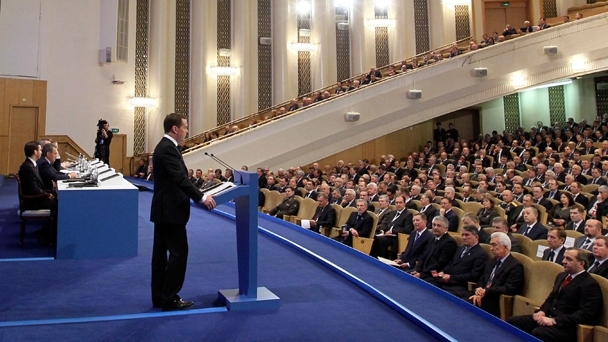 Выступая перед собравшимися, премьер-министр РФ Дмитрий Медведев отметил, что "основная задача – в самые короткие сроки провести реструктуризацию ОПК". Премьер напомнил, что доля новой военной техники и вооружений должна составить 70%, причем "эти 70% в абсолютном, подавляющем большинстве должны производиться на наших оборонных предприятиях".
