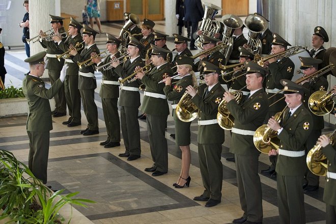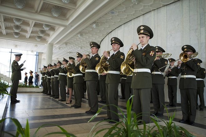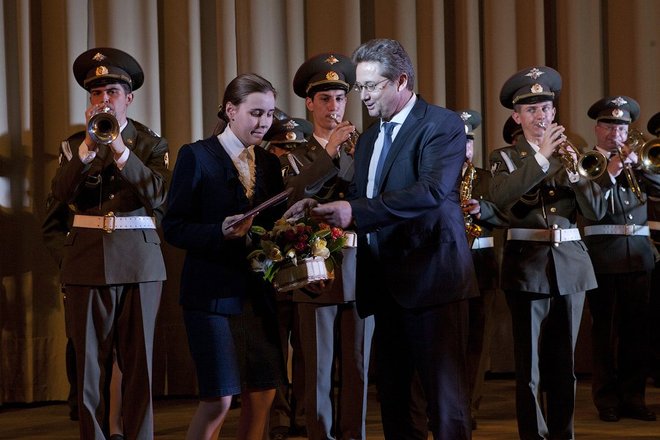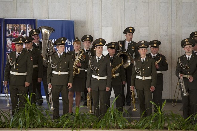 У входа в зал гостей встречали студенты МХПИ, одетые в стилизованные костюмы юнкеров. Они придали мероприятию большую торжественность.