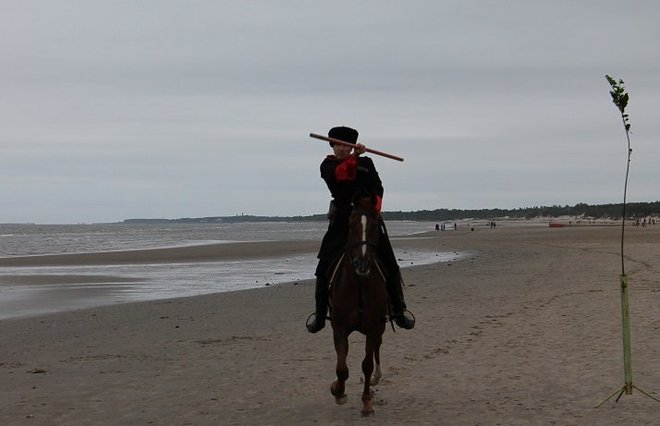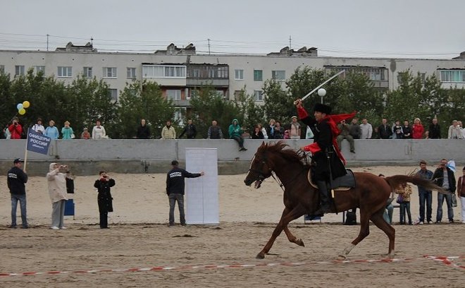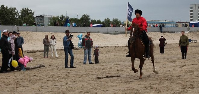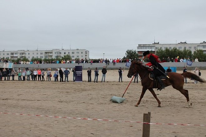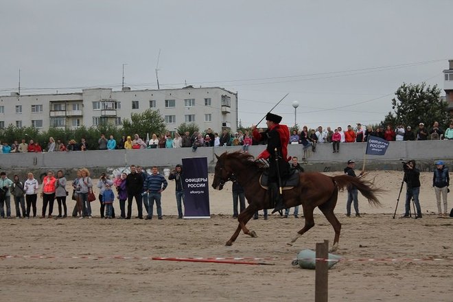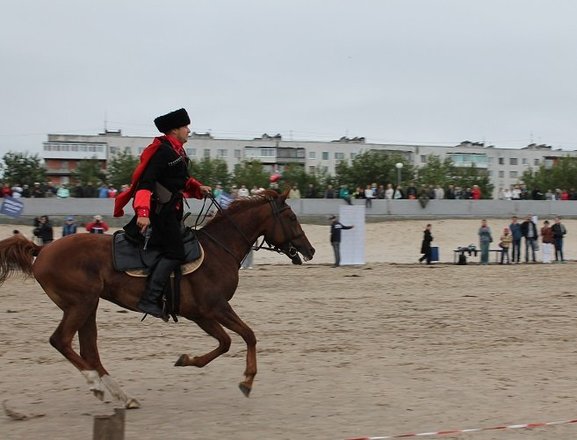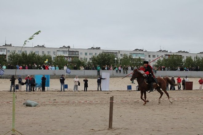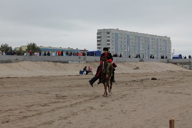 Несмотря на прохладную июльскую погоду, зрители с восторгом принимали выступление веселого казачьего коллектива и показательное «сражение» мастера джигитовки Дениса Чертова. Он ворвался на набережную прямо на коне и виртуозно «порубал» шашкой воображаемых противников.
