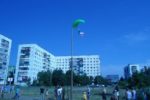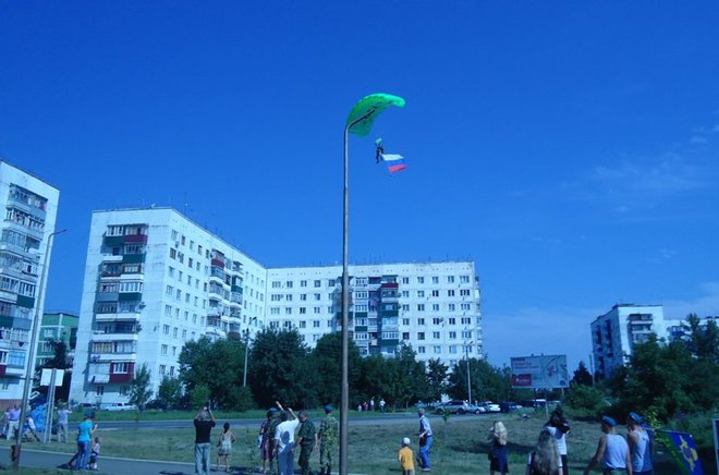 Десантники во главе с председателем регионального отделения Союза десантников Виктором Дедовым совершили прыжки с парашютом и приземлились на проезжую часть, которую к тому времени перекрыли сотрудники ГИБДД.