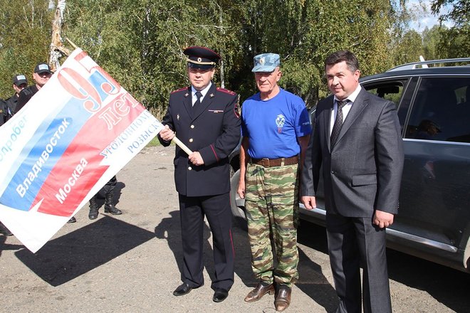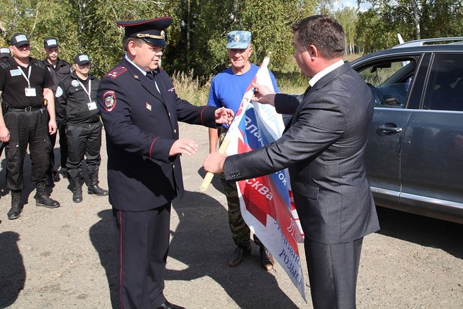 На границе Томской и Кемеровской областей сотрудники полиции и представители частных охранных предприятий Томской области присоединились к участникам автопробега, следующего по маршруту Владивосток – Москва. Из рук коллег из республики Хакасия начальник управления уголовного розыска УМВД России по Томской области полковник полиции Булат Хайруллин принял знамя автопробега «Бывших не бывает», посвященного предстоящему 95-летию образования службы уголовного розыска.