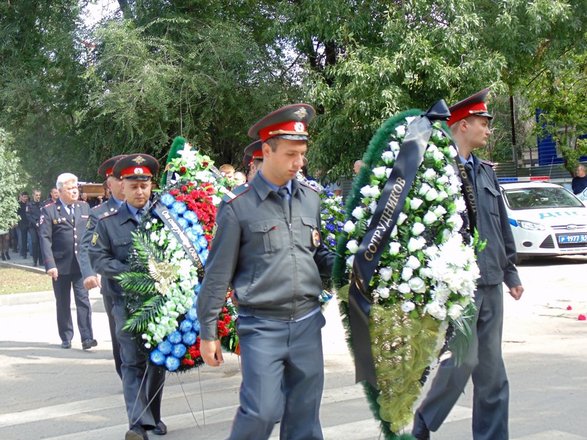Проводить погибшего сотрудника в последний путь и выразить соболезнования приехали губернатор Ростовской области Василий Голубев, начальник Главного управления вневедомственной охраны МВД России Сергей Лебедев, начальник донского главка МВД Андрей Ларионов, председатель Общественного совета при главке Эдуард Шапошников, руководство вневедомственной охраны Ростовской области и других регионов России, представители силовых структур.