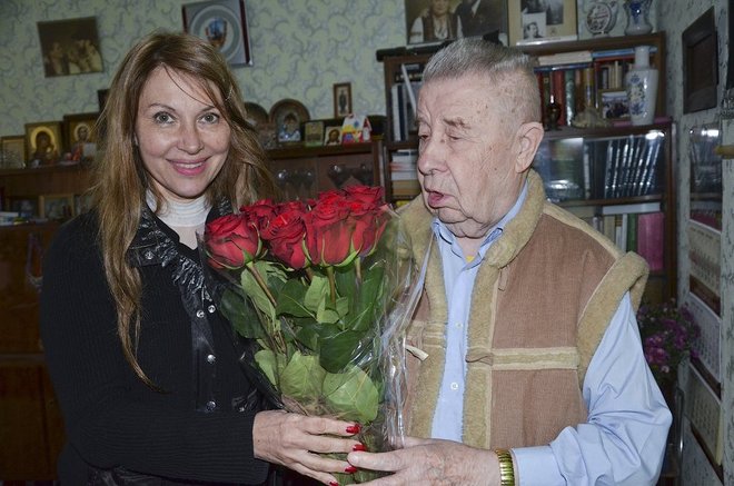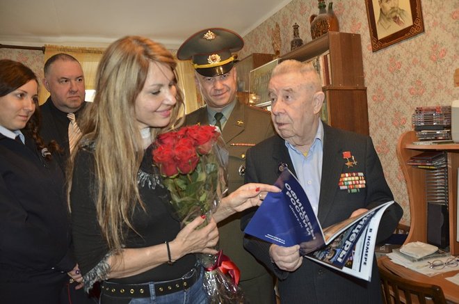 Директор фонда «Звезда» Мария Сорокина подарила юбиляру аквадиск для очищения воды, цветы, поздравительный адрес и книгу Николая Рыжкова «Великая Отечественная: битва экономик и оружие победы».