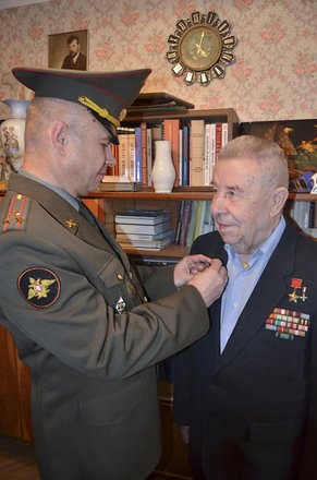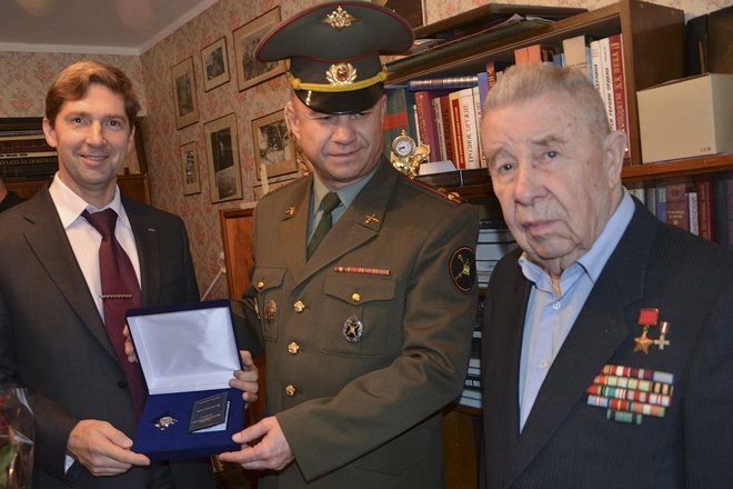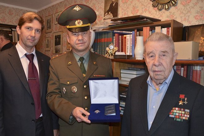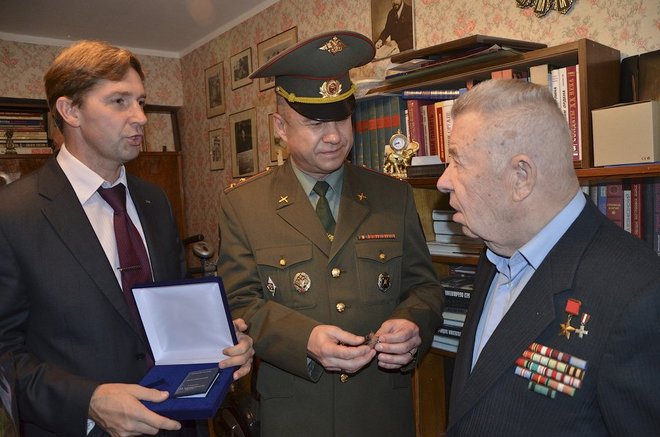 Начальник управления регионального развития «ОФИЦЕРОВ РОССИИ» полковник запаса Игорь Стрильчук и член Московского регионального отделения организации Игорь Калашников вручили ветерану-партизану орден «За офицерскую честь».