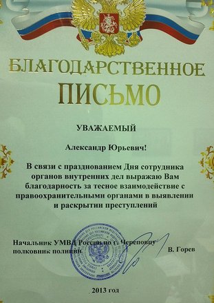 Член правления регионального отделения «ОФИЦЕРОВ РОССИИ» по Вологодской области Александр Трифанов оказал содействие органам внутренних дел в раскрытии преступления с фальшивыми денежными купюрами. За это он получил благодарственное письмо от начальника УМВД России по городу Череповец.