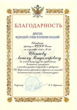 Кроме того, от имени директора ФСИН РФ председателю президиума «ОФИЦЕРОВ РОССИИ» Антону Цветкову была вручена благодарность за личный вклад в духовно-нравственное воспитание осужденных и активное участие в подготовке и проведении VII Всероссийского фестиваля творческих коллективов воспитательных колоний «Амнистия души».