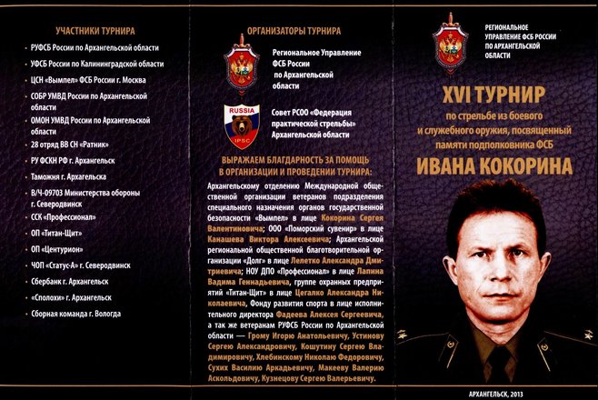 Турнир по стрельбе из боевого и служебного оружия, посвященный памяти подполковника ФСБ Ивана Кокорина проводится ежегодно, и команда от регионального отделения «ОФИЦЕРОВ РОССИИ» Архангельской области планирует участвовать в нем и в дальнейшем, улучшая, несомненно, свои результаты.