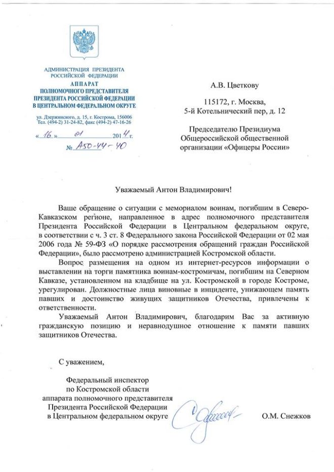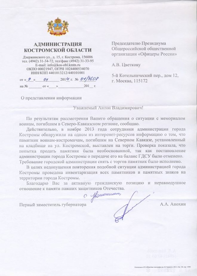 По итогам скандальной истории, когда в Костроме на интернет-торги был выставлен Мемориал воинам, погибшим на Северном Кавказе, в нашу организацию продолжают поступать ответы от официальных лиц. Справедливость удалось восстановить благодаря оперативному вмешательству журналистов Правда.Ру и «ОФИЦЕРОВ РОССИИ». Еще одно подтверждение, что общественный контроль – реальный рычаг воздействия.