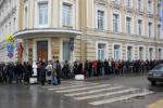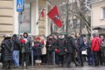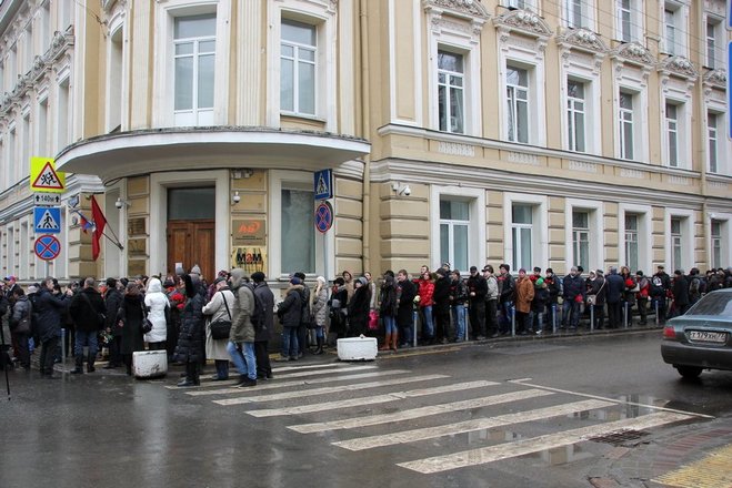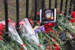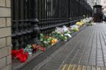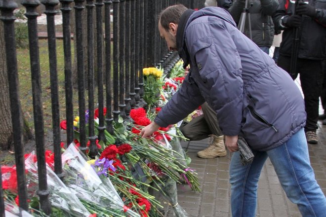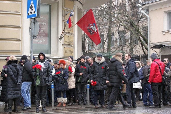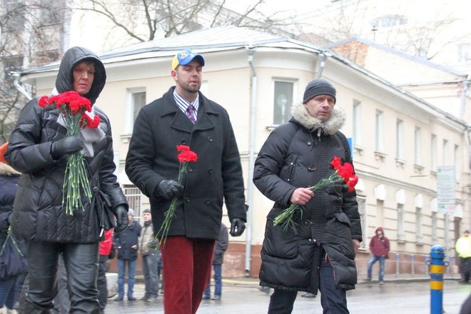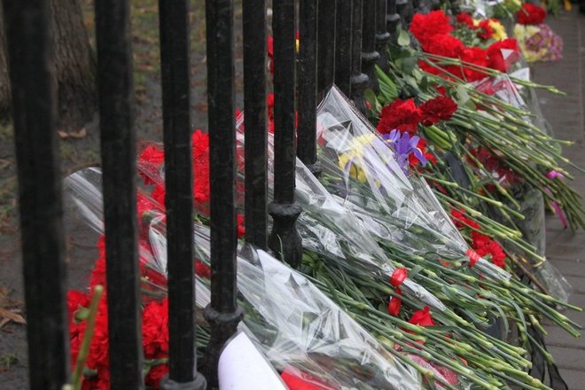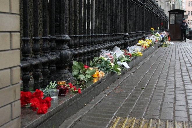 23 февраля, в День защитника Отечества, у посольства Украины в Москве состоялась гражданская акция скорби по погибшим сотрудникам спецподразделения внутренней службы Украины. Большое количество людей принесли сюда цветы, свечи и почтили их память минутой молчания.