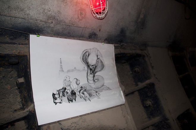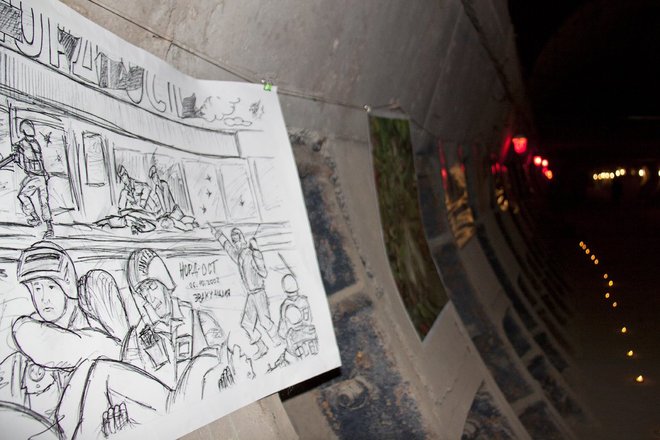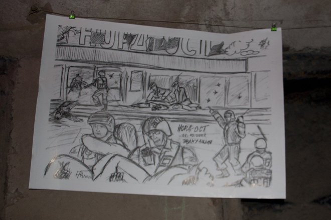 В экспозиции также были представлены работы диггера Дмитрия Прокофьева. Его зарисовки о «Норд-Осте», можно сказать, являются документами тех трагических событий. Автор делал наброски практически во время операции по освобождению заложников, когда увиденное и пережитое буквально просилось на бумагу.