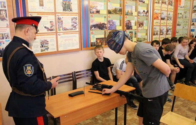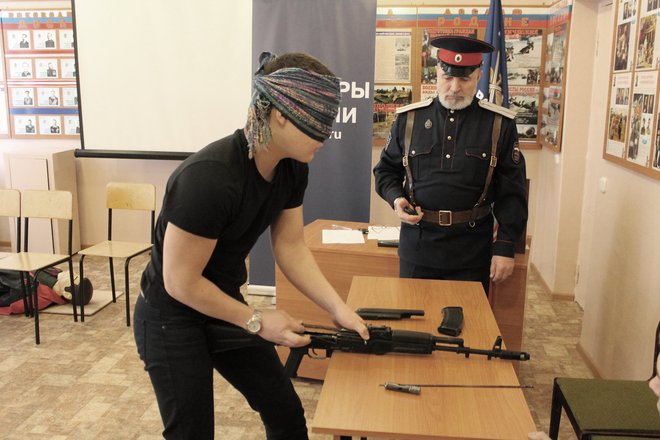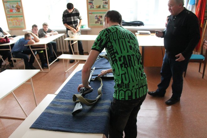 Отличилась команда школы №13, в которой молодой патриот продемонстрировал сборку/разборку автомата сразу с двумя усложняющими элементами: одной рукой с завязанными глазами.