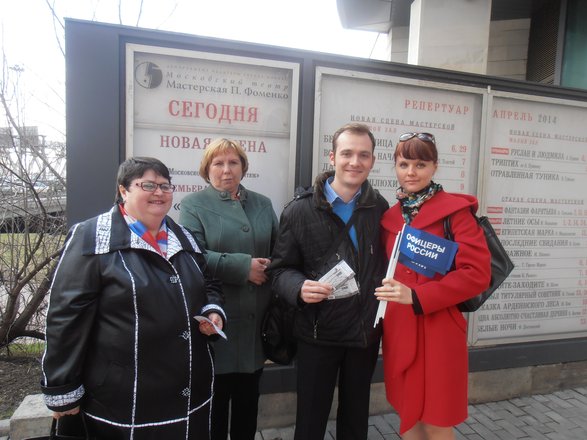 Центр социальной защиты «ОФИЦЕРЫ РОССИИ организовал культпоходы в театр Петра Фоменко. Администрация культурного учреждения на основе благотворительности выделила 50 билетов на 18 апреля, и 80 билетов на 20 апреля.