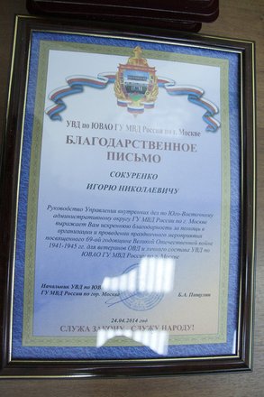 24 апреля в УВД по Юго-Восточному округу Москвы прошло торжественное мероприятие, посвященное Дню ветеранов органов внутренних дел и внутренних войск МВД России и Дню Победы.