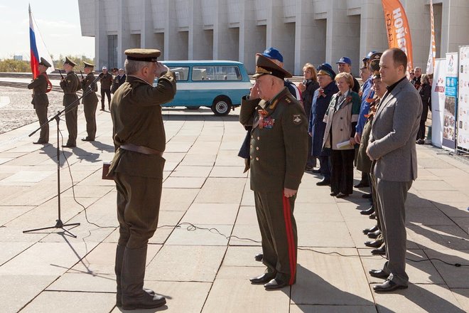 Мероприятие началось с возложения венков и цветов к Вечному огню. Затем со сцены, расположенной на ступеньках музея, с напутственным словом к участникам автопробега обратились председатель ДОСААФ России Сергей Маев, руководитель спортклуба JeepFest Константин Журавлев, народный артист СССР Василий Лановой, председатель Президиума «ОФИЦЕРОВ РОССИИ» Антон Цветков, представители клубов военачальников РФ и Героев России и Советского Союза.