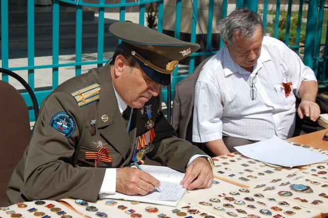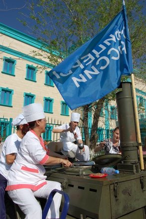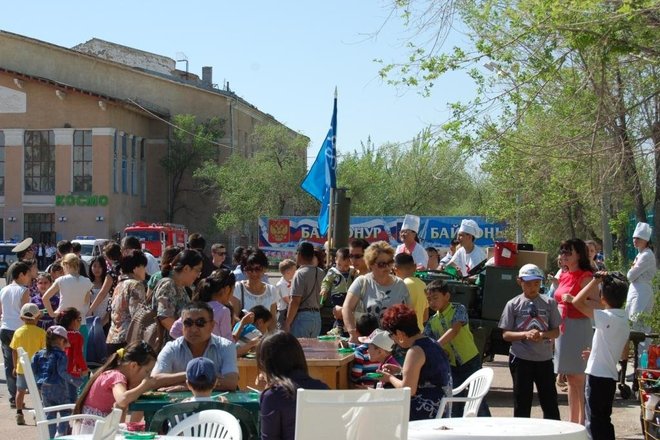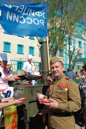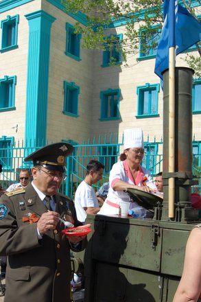Большой интерес у байконурцев и их искренне восхищение вызвали мероприятия, организованные региональным отделением «ОФИЦЕРОВ РОССИИ» на площади: настоящая полевая кухня, накормившая вкусной солдатской кашей более тысячи человек, выставка памятных значков из коллекции подполковника запаса Ришата Латыпова, а также возможность сфотографироваться в форме военного времени с оружием тех лет.