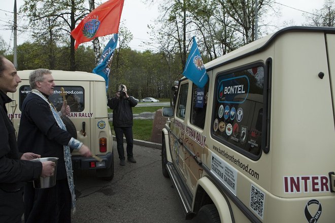 Здесь, после объявленной минуты молчания и возложения цветов, прошла церемония вручения иконы Святого Георгия Победоносца – покровителя Международного кругосветного марша ветеранов «Боевое братство – Battle Brotherhood» участникам автопробега, а также проеведен чин освящения внедорожников.