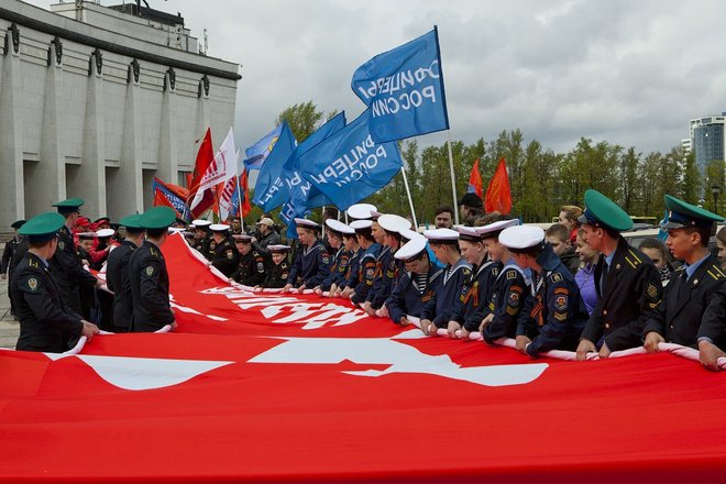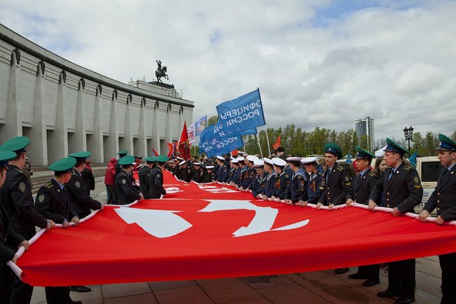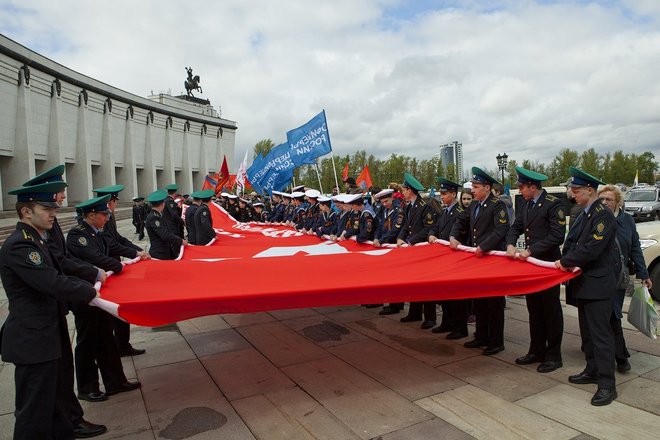 В каждом городе, в котором побывали автомобили проекта «Наша Великая Победа», его участники разворачивали в памятных местах масштабную копию Знамени Победы – как символа связи поколений и единства народов современной России и стран Содружества Независимых Государств. Под оркестровую композиция на песню «День Победы» 200-метровую копию Знамени организаторы и гости торжества развернули и на Поклонной горе, на площади перед негасимым Вечным огнем.