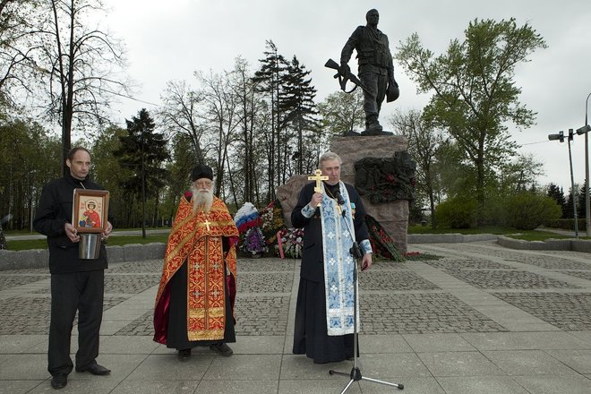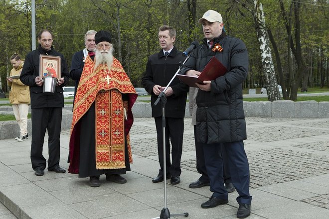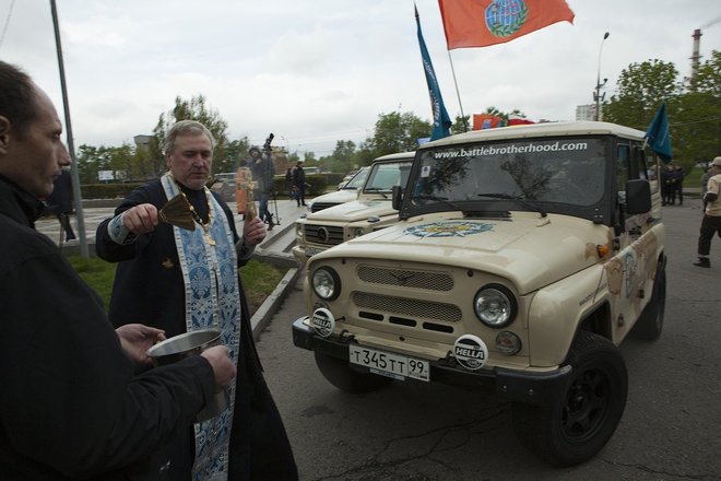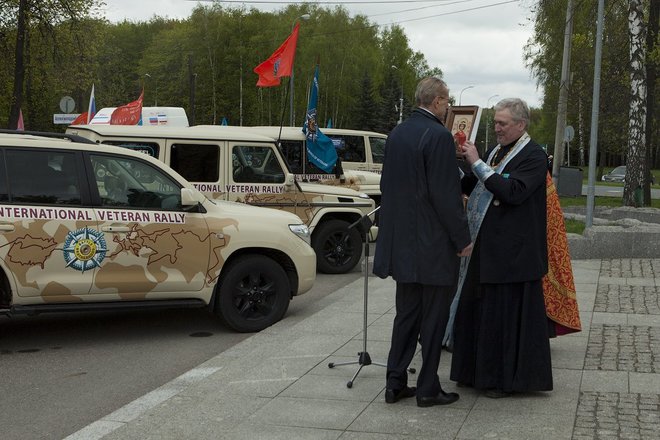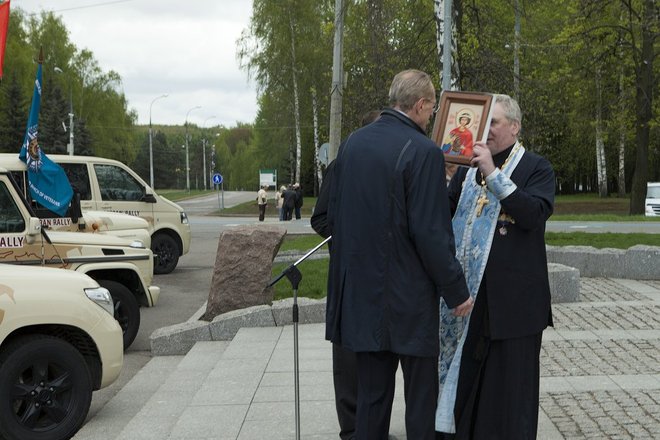 Здесь, после объявленной минуты молчания и возложения цветов, прошла церемония вручения иконы Святого Георгия Победоносца – покровителя Международного кругосветного марша ветеранов «Боевое братство – Battle Brotherhood» участникам автопробега, а также проеведен чин освящения внедорожников.