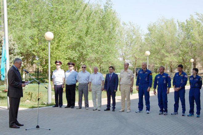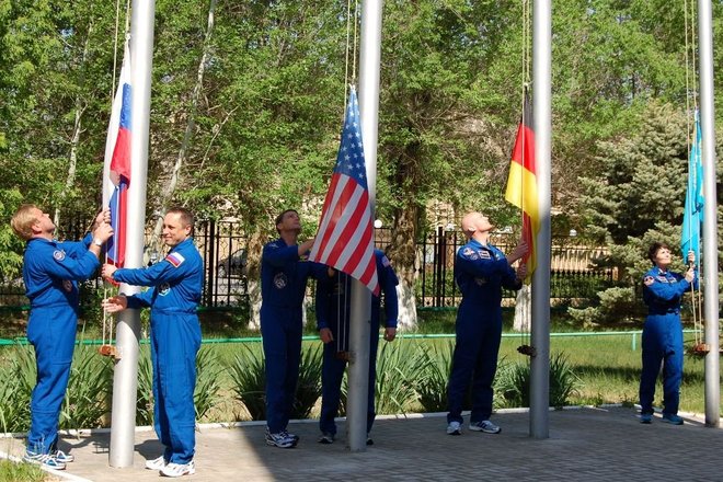 17 мая на космодроме Байконур в Испытательном учебно-тренировочном комплексе НИИ Центра подготовки космонавтов им. Ю.А. Гагарина были подняты флаги России, США, Германии и Казахстана – государств-участников программы полета экипажей 40/41-й длительной экспедиции на Международную космическую станцию.