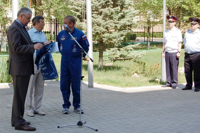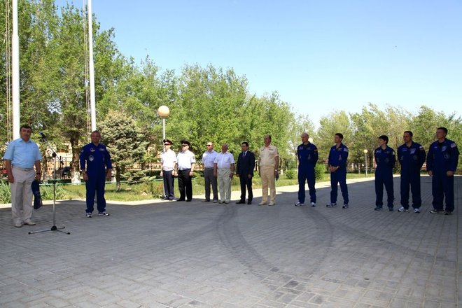 Участники церемонии – члены Президиума «ОФИЦЕРОВ РОССИИ» на Байконуре: исполняющий обязанности главы городской администрации Анатолий Петренко, начальник Управления Роскосмоса на Байконуре Анатолий Белоконь, а также заместитель акима Кзыл-Ординской области, специальный представитель президента Республики Казахстан на космодроме Байконур Серик Кожаниязов пожелали экипажам успешного полета.