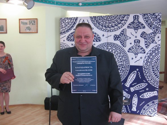Региональный представитель «ОФИЦЕРОВ РОССИИ по Республике Коми Владимир Туров выступил перед членами отделения и сыктывкарцами, собравшимися на церемонию открытия выставки. Он поздравил всех с Днем Победы и вручил подарки именинникам Вячеславу Немирову и Сергею Кравченко. Благодарность и памятная медаль «Ветеран МВД» также были вручены руководителю военно-патриотического клуба «Скиф», ветерану боевых действий на Северном Кавказе, активисту отделения Андрею Володарскому за активную гражданско-патриотическую работу с подростками.