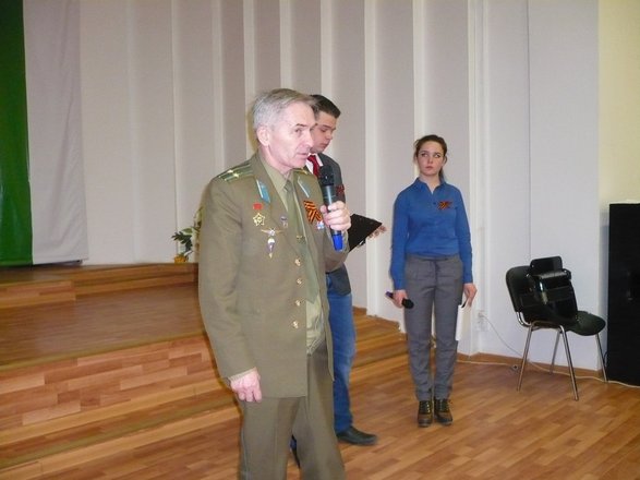 Региональный представитель «ОФИЦЕРОВ РОССИИ» по Республике Коми Владимир Туров в своем выступлении перед ветеранами, студентами и педагогическим составом академии рассказал об истории георгиевской ленточки. Напомнил, что 6 мая – День Святого Георгия Победоносца, и что с 2000 года орден Святого Георгия вновь стал одной из высших наград России.