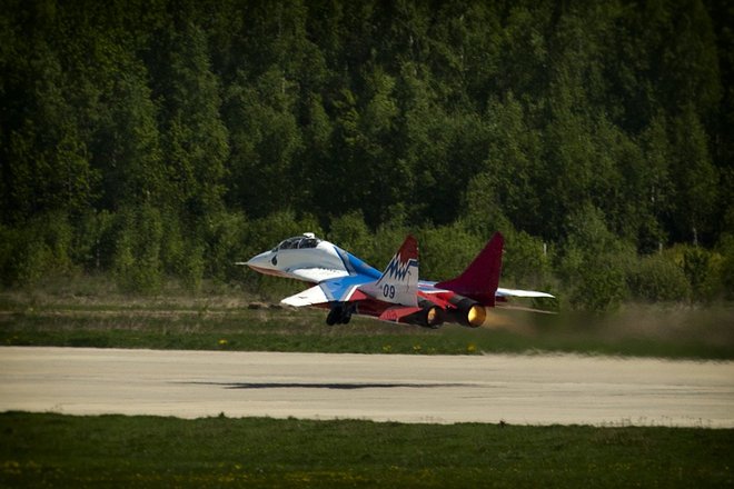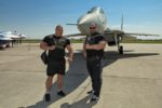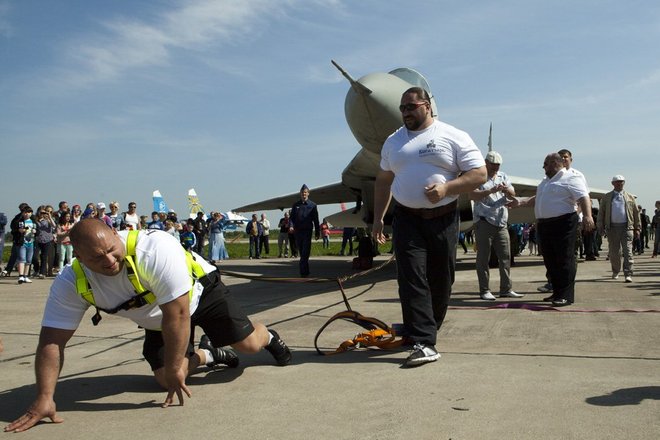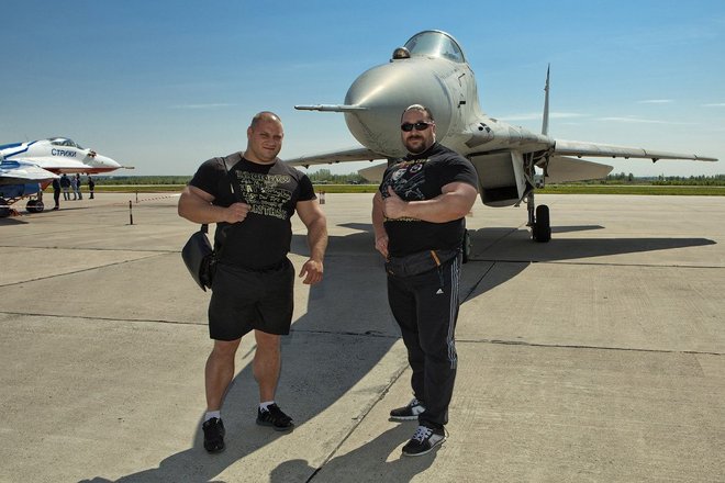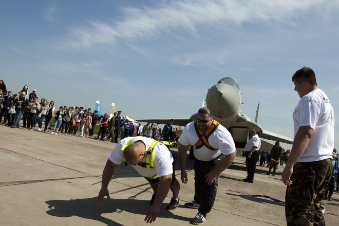 Затем шоу продолжилось на земле. Представители Фонда развития и поддержки спортсменов и организаций по силовому многоборью «Богатырь» продемонстрировали свою богатырскую силу в силовой тяге самолета МиГ-29, а воспитанники патриотических клубов показали зрителям приемы рукопашного боя.