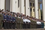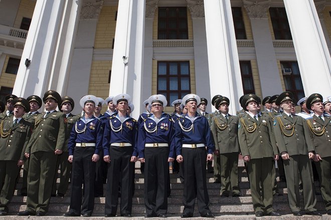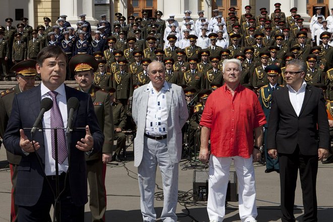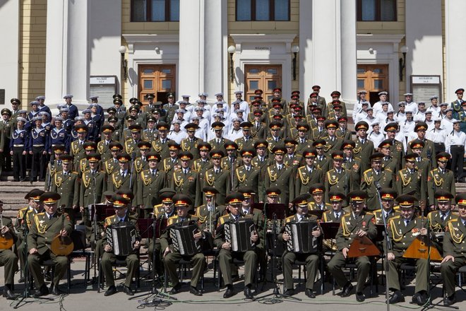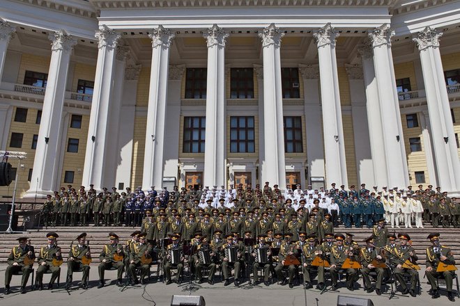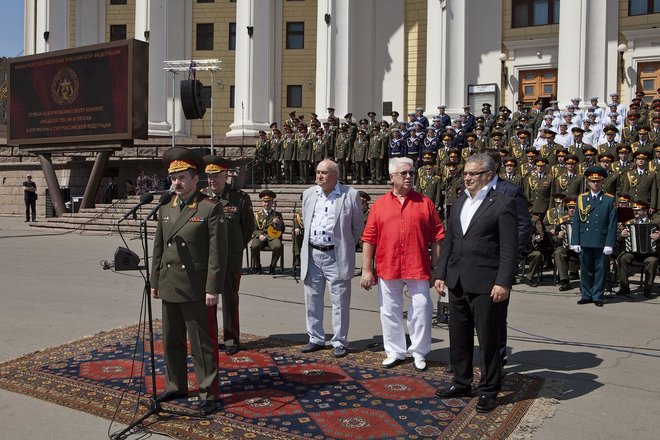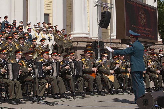 Уникальный фестиваль военных музыкальных коллективов открылся 20 мая в Москве с исполнения конкурсантами гимна России на ступенях Центрального академического театра Российской армии во главе с легендарным хором «александровцев».