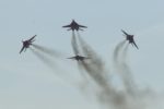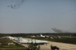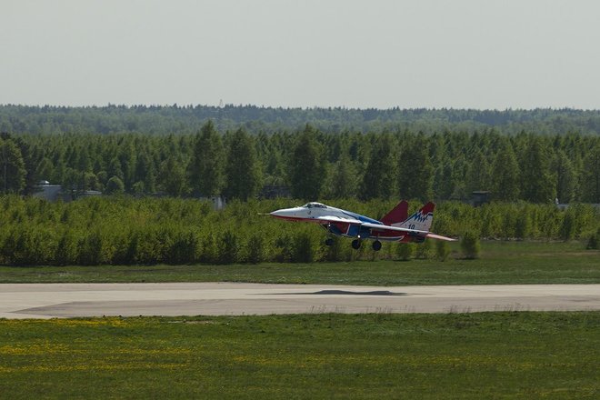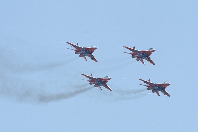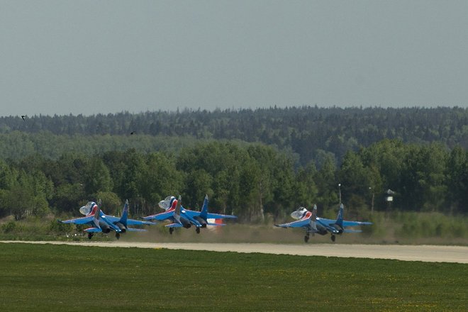 Главная часть праздника – показательные полеты. В арсенале «Стрижей» имеются десятки фигур высшего пилотажа с говорящими названиями – «конверт», «пирамида», «ромб», «стрела», «крест» и так далее. И конечно, же зрители могли увидеть знаменитый «кубинский бриллиант», который «Стрижи» показали в тандеме с «Русскими витязями».