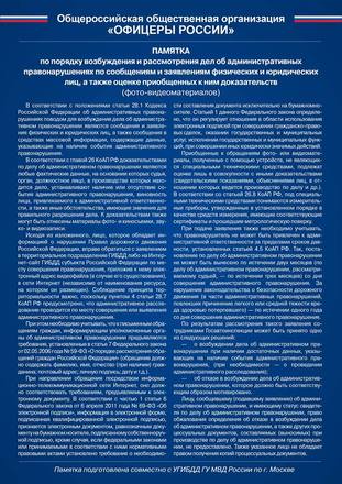 Кроме того, «ОФИЦЕРЫ РОССИИ» совместно с УГИБДД Москвы разработали методические рекомендации (см. фото) для граждан по документированию таких правонарушений. Каждый желающий сможет самостоятельно зафиксировать факт нарушения ПДД, сообщить в нашу организацию, а мы централизованно передаем информацию в ГАИ и берем на контроль.