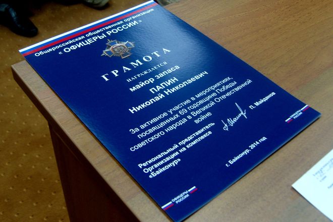 Региональный представитель «ОФИЦЕРОВ РОССИИ» на комплексе «Байконур» Петр Майданов и руководитель регионального отделения Евгений Раковский отметили активное и деятельное участие РО в городских мероприятиях таких как – празднование Дня Победы, поздравление ветеранов и угощение горожан из полевой кухни «солдатской» кашей, завершение учебного года и напутствие будущих защитников Отечества, День защиты детей и конкурс рисунков на асфальте, День России, поздравление гостей и вручение им ленточек российского триколора, а главное – все, что было связано с исторической отправкой на космическую орбиту и возвращение летчиком-космонавтом, Героем России Михаилом Тюриным на Байконур флага «ОФИЦЕРОВ РОССИИ».