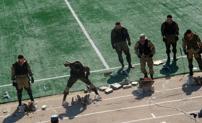 Свои действия при захвате машины инкассаторов вооруженными преступниками показали полицейские отдела вневедомственной охраны и отдела государственной инспекции безопасности дорожного движения. А сотрудники отдельного батальона продемонстрировали специальные упражнения по пресечению массовых беспорядков.