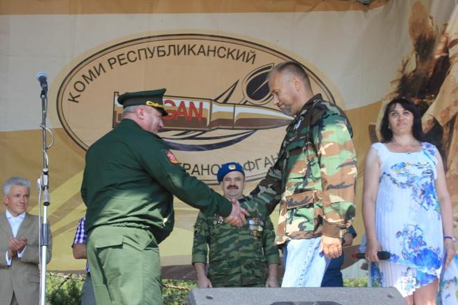 Десантники и гости мероприятия также приняли поздравления от руководителя администрации МО МР «Корткеросский» Василий Гончаренко и других официальных лиц. Военком Республики Коми Дмитрий Федин вместе с региональным представителем нашей организации вручили ветеранам Афганской войны медаль Министерства обороны «В память 25-летия окончания боевых действий в Афганистане». Медали были вручены и членам нашего регионального отделения Сергею Вершинину, Владимиру Турову, Валерию Копнину, Вадиму Путикову, Григорию Шуктомову, Евгению Сажину.