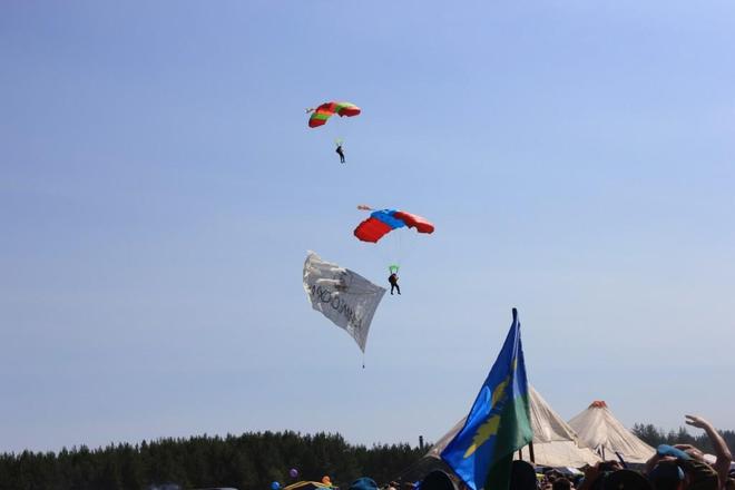 Кульминацией праздника стали показательные прыжки парашютистов, спортивные состязания и конкурсы. Всех желающих накормили солдатской кашей. После игровой и спортивной программы Владимир Туров вручил победителям и призерам дипломы и призы.