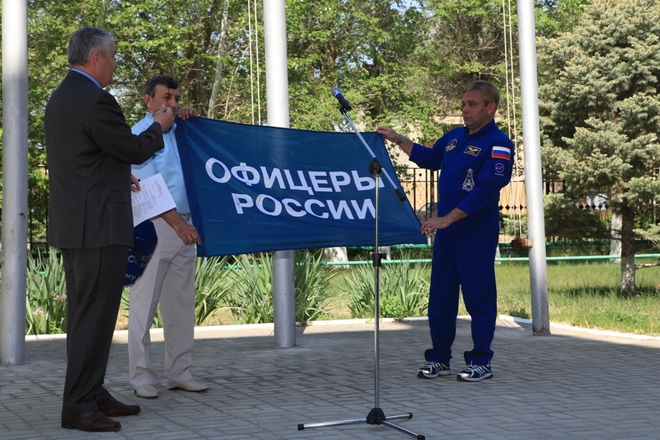 17 мая на традиционной церемонии поднятия государственных флагов командир основного экипажа 40/41 экспедиции летчик-космонавт, Герой Российской Федерации полковник Максим Сураев вручил флаг «ОФИЦЕРОВ РОССИИ» региональному представителю.